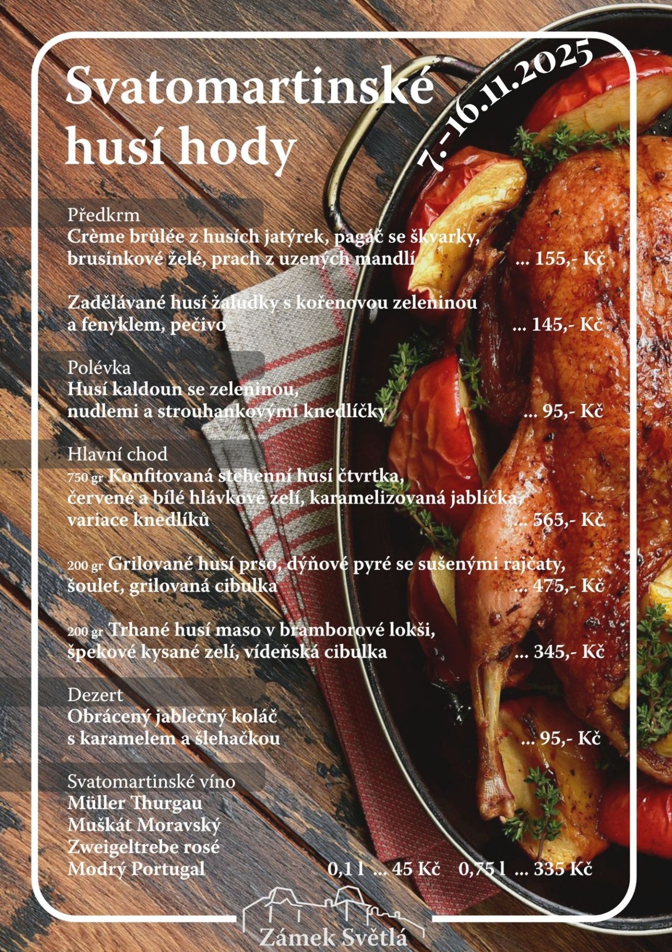 Srdečně Vás zveme do Zámecké restaurace ve Světlé nad Sázavou na tradiční Svatomartinské menu, které si vychutnáte od 7. do 16. listopadu 2025.